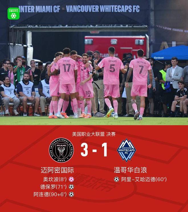 北京时间12月7日下午3点30分,美国职业足球大联盟总决赛在蔡斯体育场拉开帷幕。温哥华白帽队对阵迈阿密国际队。裁判是费舍尔。上半场,阿连德传中,导致奥坎波自摆乌龙。下半场阿里·艾哈迈德扳平比分,随后梅西助攻德保罗和阿连德破门。最终,迈阿密国际队3-1击败温哥华白帽队,夺得美国职业足球大联盟冠军!重头戏:第8分钟,梅西解围,随后阿连德传中,奥坎波乌龙球,迈阿密国际1-0开启梦幻之旅!第60分钟,阿里·艾哈迈德分球未进球,温哥华白帽队1-1扳平!第71分钟,梅西断球后传球帮助德保罗破门。第90分钟和第6分钟迈阿密国际2-1,冠军已锁定!梅西补时助攻阿连德破门,国际米兰3-1!最精彩的时刻是双方球员上场,战斗即将打响。第4分钟。第13分钟,阿连德破门,皮球高出横梁。双方激战,巴尔塔萨尔·罗德里格斯吃到黄牌。第17分钟,终场哨响后布莱恩-怀特推搡被出示黄牌。第25分钟,萨比手球给对手定位球。梅西主罚直接攻门但被没收。第28分钟,梅西中路得球打门。球被挡住了。第38分钟,阿里·艾哈迈德近距离射门。第41分钟,里奥斯将??球挡出。第48分钟,穆勒冲向马克头球,里奥斯将??球没收。第45分钟,奥坎波阻挡犯规,被出示黄牌。第48分钟,法尔肯防守犯规,被出示黄牌。第56分钟,梅西头球攻门,皮球稍稍偏出。第63分钟,萨沃伊第74分钟,奎瓦斯轻拍梅西,亮出黄牌w卡。第85分钟,梅西试图断球,被刺犯规。第90分钟和第1分钟,梅西继续逃离人群进入禁区。球队阵容 技术统计