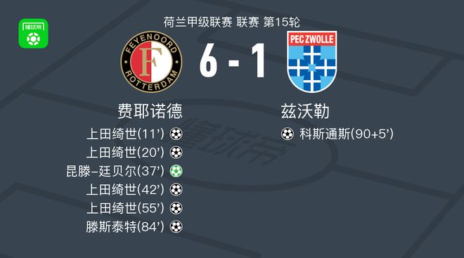 北京时间12月7日,荷兰足球联赛第15轮比赛开始。费耶诺德主场迎战兹沃勒。比赛中,上田崔在贡萨洛·博尔赫斯的助攻下首开纪录,随后昆滕·廷伯送出精准传球,帮助他再下一城。不久之后,昆顿·廷伯主罚点球进一步扩大领先优势。上半场临近结束时,斯马尔成功助攻,上田基完成个人第三球。比赛再次易边再战,卢西亚诺·瓦伦特送出精彩传球,上田桐生破门取得第四球。第84分钟,乔丹主帅帮助滕施泰特进球,继续拉开比分。比赛进入补时阶段,兹沃勒在科斯通斯的德罗伊助攻下拿下一分。最终比分决定费耶诺德6-1战胜兹沃勒。第11分钟,费耶诺德球员贡萨洛·博尔赫斯助攻上田桐生进球。第20分钟,费耶诺德球员昆滕·蒂姆布尔助攻上田健雄进球湖第37分钟,费耶诺德球员昆滕·蒂姆伯主罚点球破门。第42分钟,费耶诺德球员斯马尔助攻上田桐生进球。第55分钟,费耶诺德球员卢西亚诺·瓦伦特助攻上田桐生进球。第84分钟,费耶诺德球员乔丹·博斯帮助滕斯施泰特进球。下半场补时第5分钟,兹沃勒球员德罗伊助攻科斯通破门。球队阵容 技术统计