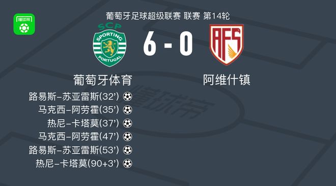 北京时间12月14日,葡超第14轮比赛,葡萄牙体育主场迎战阿维什镇。比赛中,路易斯·苏亚雷斯率先得分,为球队打开了胜利之门。马克西·阿劳霍接维加尼迪斯助攻再次突破,进一步扩大领先优势。很快,杰尼卡塔莫也在科乔拉什维利的帮助下将球送入对方球门。上半场结束前,葡萄牙体育取得三球领先。易边再战,瓦贾尼迪斯再次送出助攻,马克西·阿劳霍梅开二度。随后,马特乌斯·雷斯精准传球,帮助路易斯·苏亚雷斯打进第二球。下半场补时阶段,特林康突破后送出关键传球,杰尼·卡塔莫获得再进一球的机会。全场比赛结束,葡萄牙体育6-0击败阿维什镇,主场强势获胜。精彩瞬间,第32分钟,CP队球员路易斯·苏亚雷斯进球。第35分钟,葡萄牙体育队破门。层瓦贾尼迪斯助攻马克西·阿劳霍进球。第37分钟,葡萄牙体育球员科乔拉什维利助攻格尼·卡塔莫进球。第47分钟,葡萄牙体育球员瓦贾尼迪斯助攻马克西·阿劳霍破门。第53分钟,葡萄牙体育球员马特乌斯·雷斯助攻路易斯·苏亚雷斯进球。下半场补时第3分钟,CP球员特林考助攻格尼卡塔莫破门。球队阵容 技术统计